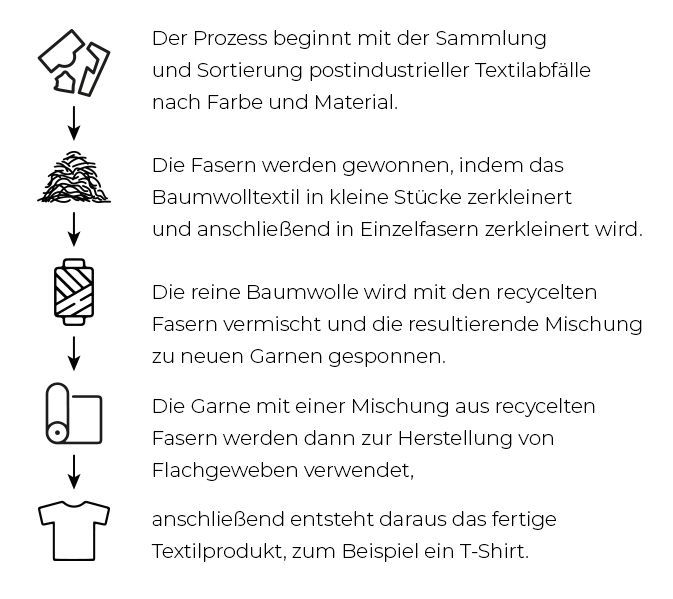 stammt aus postindustriellen Textilabfällen. Die aus diesen Abfällen gewonnenen Fasern werden zusammen mit neuen Fasern zu Garnen versponnen, die für die Herstellung von Flachtextilien verwendet werden. Dies reduziert die Menge an Material, das weggeworfen werden würde.
