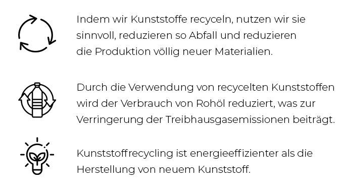 wird aus gebrauchten Kunststoffmaterialien hergestellt, die sortiert und gereinigt wurden. Das gereinigte Material wird in kleine Stücke gemahlen, die kleine Körnchen oder Flocken bilden. Diese werden dann bei hohen Temperaturen geschmolzen. Die entstehende Schmelze wird dann zum Spinnen verwendet. Die so gebildeten Fasern werden zur Garnproduktion verwendet oder die recycelten Fasern werden zusammen mit neuen Polyesterfasern versponnen. Aus dem Garn werden dann Flachtextilien hergestellt, aus denen das Bekleidungsprodukt gefertigt wird. Das gibt Plastikmüll eine neue Chance.