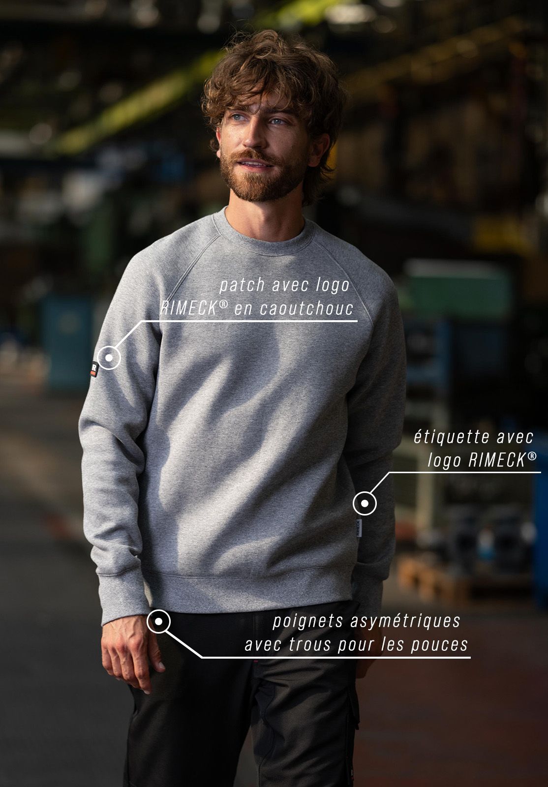Le sweat-shirt de travail VERTEX W42 comporte des logos visibles. Il y a un patch en caoutchouc de la marque RIMECK® sur la manche et une étiquette tissée sur la couture latérale.