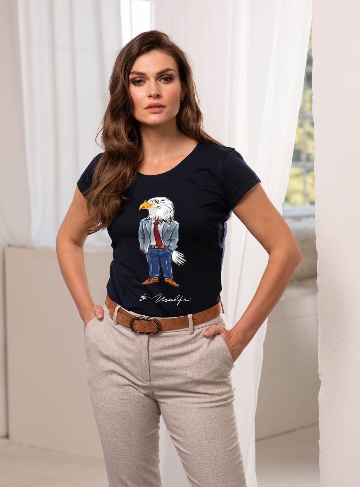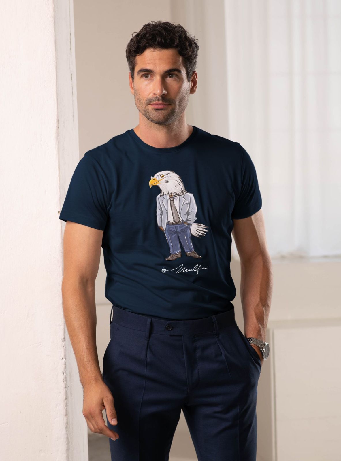 Charytatywna koszulka męska w kolorze granatowym Mr. MALFINI z motywem orła jako formalnego dżentelmena w marynarce i krawacie.
