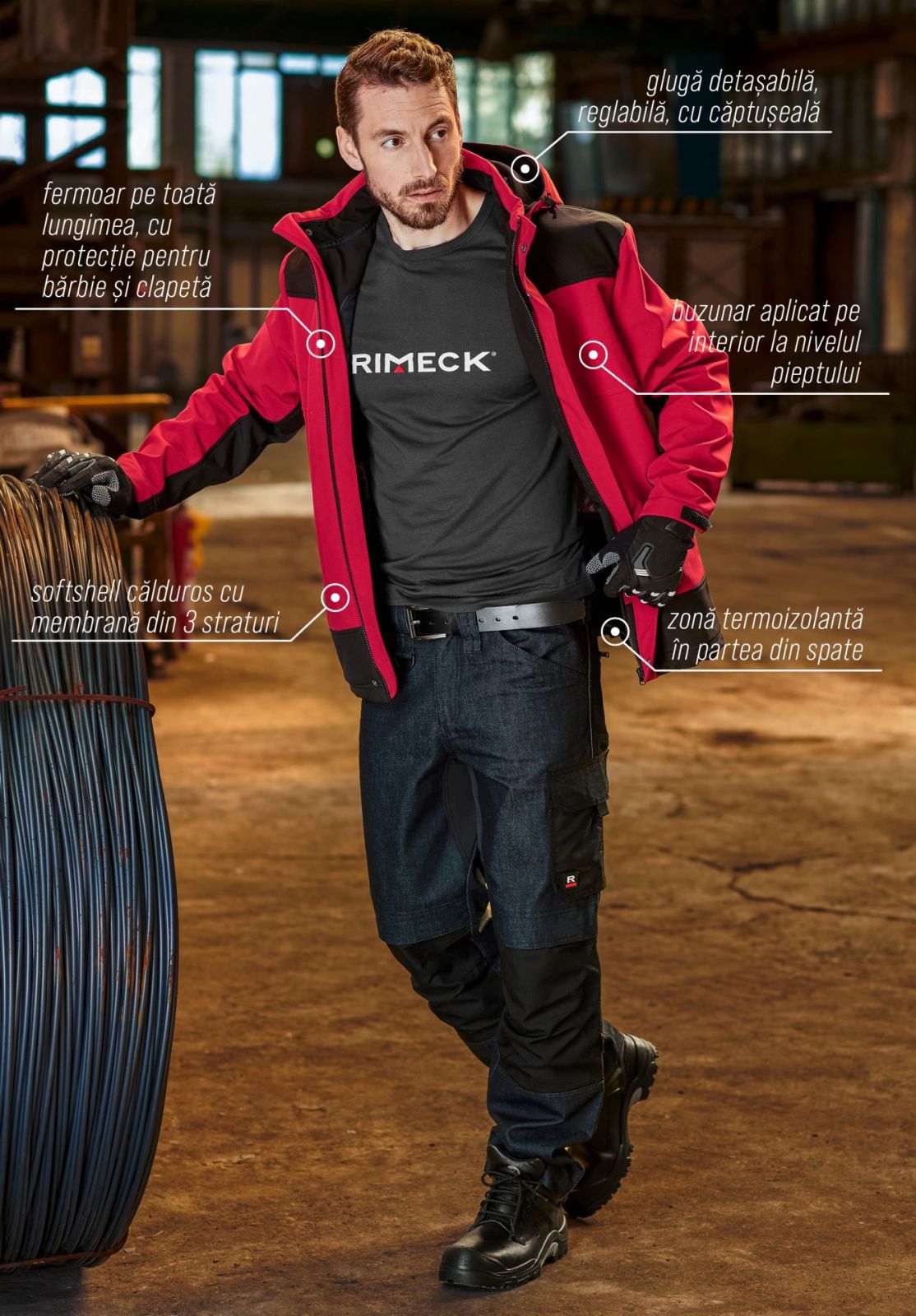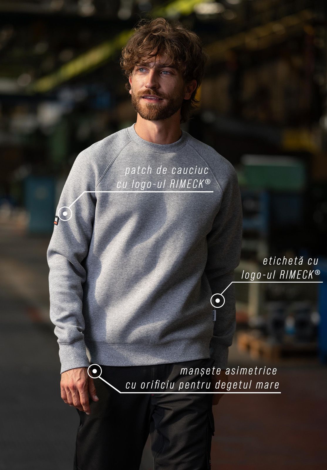 VERTEX W42 hanorac pentru muncă cu logo-uri vizibile. Acesta prezintă un patch de cauciuc cu marca RIMECK® pe mânecă, precum și o etichetă textilă în cusătura laterală.