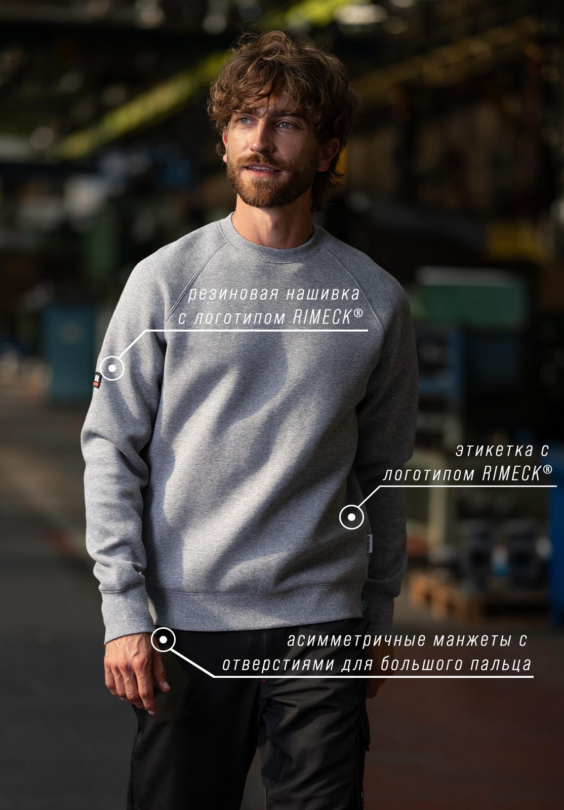 На рабочей толстовке VERTEX W42 есть логотипы. На рукаве - резиновая нашивка с логотипом RIMECK®, а на боковом шве — тканая бирка.